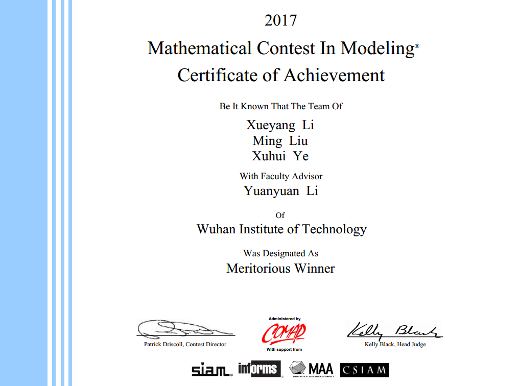 本网讯(通讯员刘华)近日,2017年美国(国际)老员工数学建模竞赛(MCM/ICM)获奖名单揭晓,公司参赛的五个团队中,理公司数学建模团队荣获一等奖(Meritorious Winner),另四个团队均获三等奖(Successful Participant)。