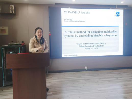 本网讯(通讯员 周曼曼)3月27日下午,澳大利亚莫纳什大学数学公司田天海教授应邀在公司304am永利集团四楼会议室作题目为“通过嵌入双稳态系统来设计多稳态系统的方法”的学术讲座。本次报告会由公司副经理李圆媛教授主持,公司相关教师、全体研究生参加了本次活动。