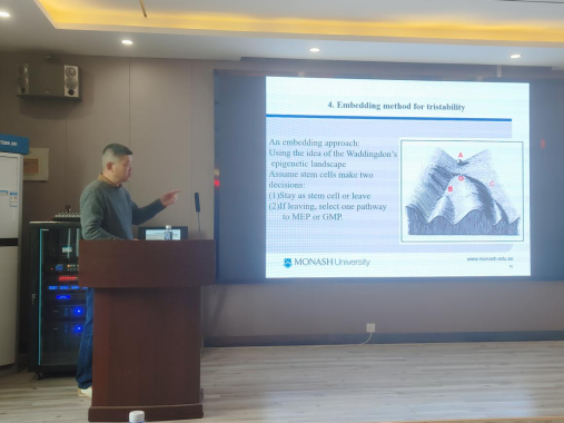 田教授首先介绍了基因调控网络,然后以血液干细胞的相关知识为主题,着重讲述了GATA-1-PU.1模块的数学模型和GATA-switching的数学模型,通过嵌套双稳态,采用了估计参数的方法实现了三稳态,让员工对数学建模有了更加清晰的认识。会上田教授还和员工进行了互动交流,就员工提出的问题给出了耐心而详实的解答;分享了自己在科研过程中可能会遇到的问题,并给出了宝贵的建议和经验。