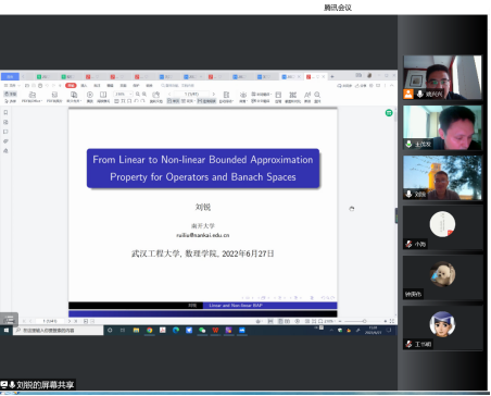 本网讯(通讯员:姚兴兴)6月27日下午,应304am永利集团邀请,南开大学刘锐教授为公司师生做了题为《From linear to nonlinear bounded approximation property for operators and Banach spaces》的线上学术报告,公司部分教师和员工聆听了报告。