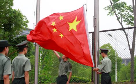 七点整,升旗仪式正式开始。国旗护卫队的同学们踏着铿锵有力的步伐护送国旗迈向升旗台。在嘹亮的国歌声,五星红旗缓缓升起,全体师生向国旗行注目礼。