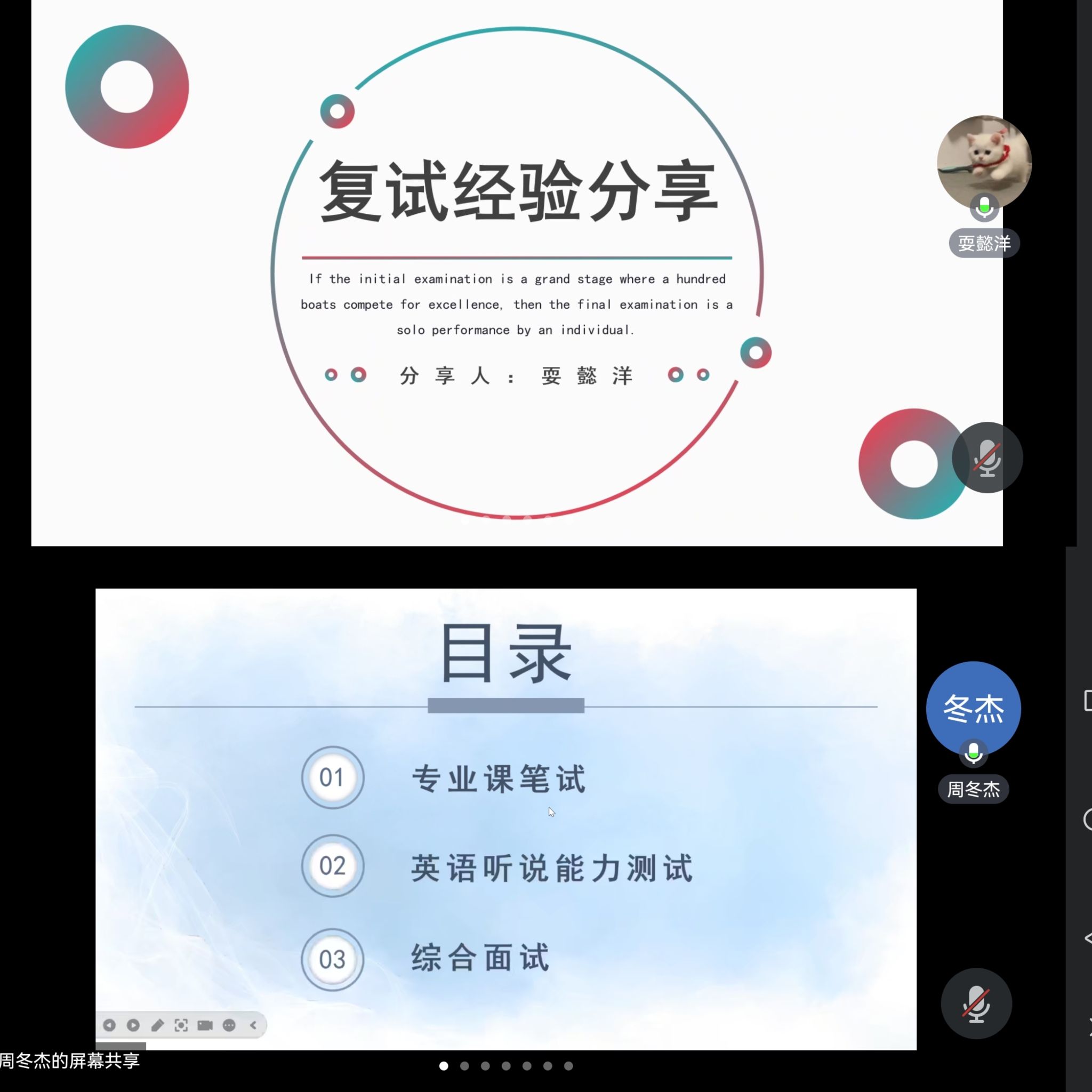 “学长学姐复试经验分享会”邀请了2019级李汉卿、耍懿洋、周青松、张丰艺、周冬杰五位成功“上岸”的优秀学长学姐,作为分享嘉宾。针对不同时间段的准备工作,学长学姐们提醒同学们一定要把握好复试前的黄金时间,认真规划,就英文自我介绍、英文问答、专业课笔试、导师联系、调剂信息搜集等多个方面进行详细阐述,同时强调应注意面试着装与礼仪,保持良好心态,积极备战复试。