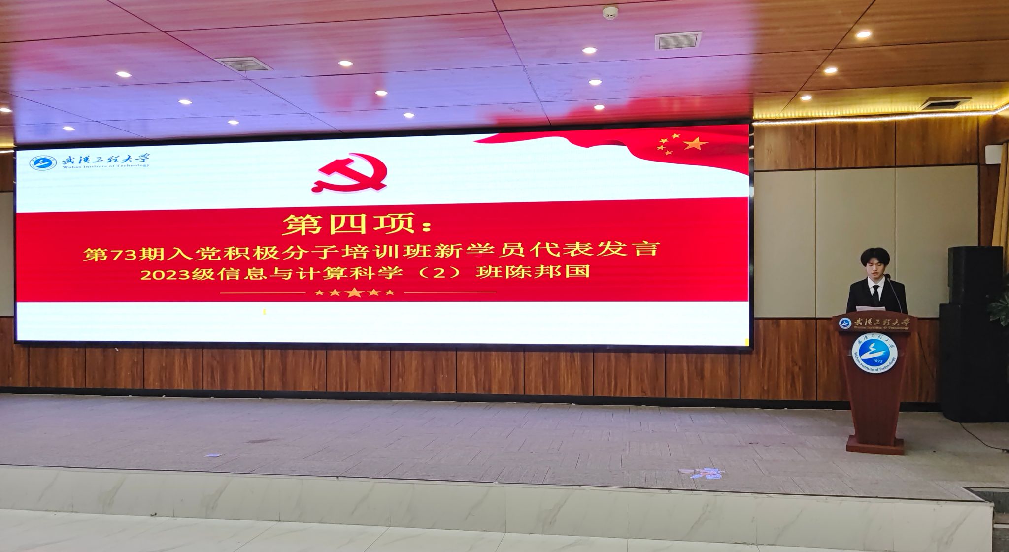 2023级信息与计算科学(2)班陈邦国作为新学员代表发言,他表示作为一名入党积极分子,必须坚定理想信念,铸牢思想之基;端正入党动机,锤炼道德修养;提升理论素养,坚持学以致用,以实际行动积极向党组织靠拢。
