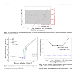 该论文通过分子动力学模拟(如图),从能量耗散方式,静力加载时的最大荷载,弹道极限速度,应力波的传播方式以及裂纹的开裂形式探究了不同堆垛方式的双层六方氮化硼的力学行能,最终得出AB(nitrogen)堆垛的双层六方氮化硼力学性能最好。本研究为未来纳米装甲的设计和合成提供了指导作用。