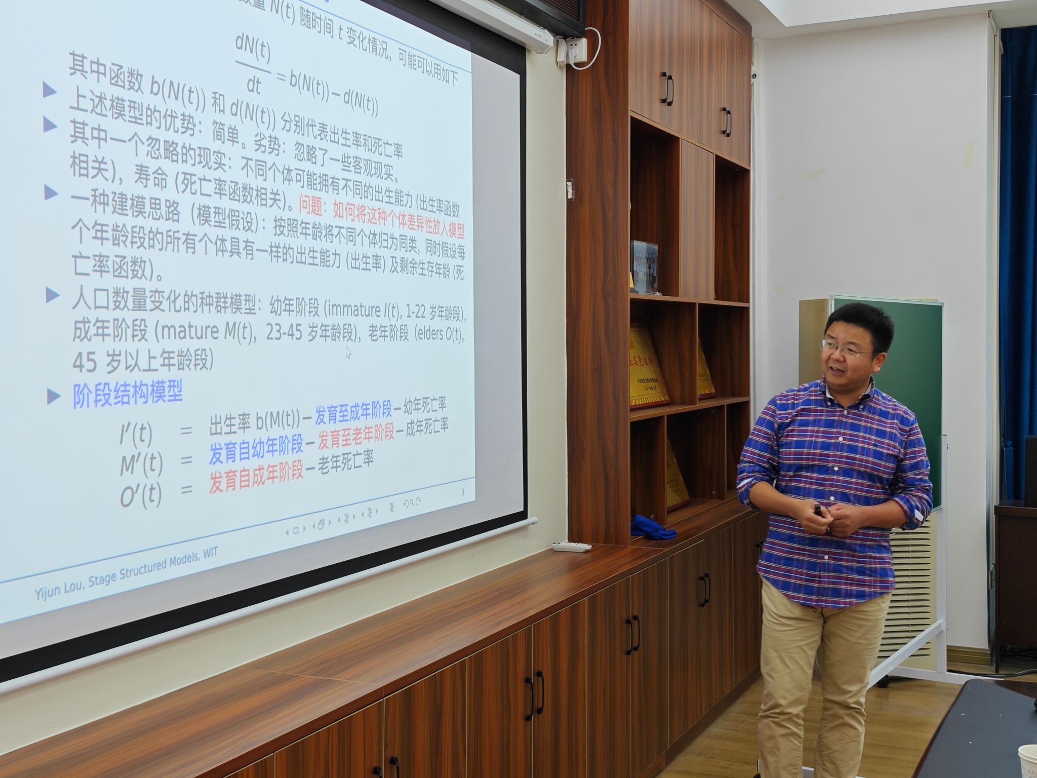 香港理工大学楼一均博士报告的题目为“具有阶段结构的种群生长模型介绍”。基于种群增长模型和疾病传播模型阐释了为何考虑阶段结构模型,并用两类常用的基于积分方程和偏微分方程来描述阶段结构模型,在进一步的发育期分布假设下,给出了阶段结构模型中的转化率问题的两种简约模型。