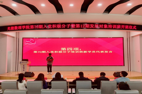 2021级数据科学与大数据技术(2)班许文轩作为第70期入党积极分子培训班学员代表发言,他表示将提高思想认识,认真学习党课内容,积极参加实践活动,在学习和生活中以一名党员的标准严格要求自己,不断提高综合素质。并呼吁第70期入党积极分子端正学习态度,认真参加党课培训,提升思想认识,争取早日加入党组织。