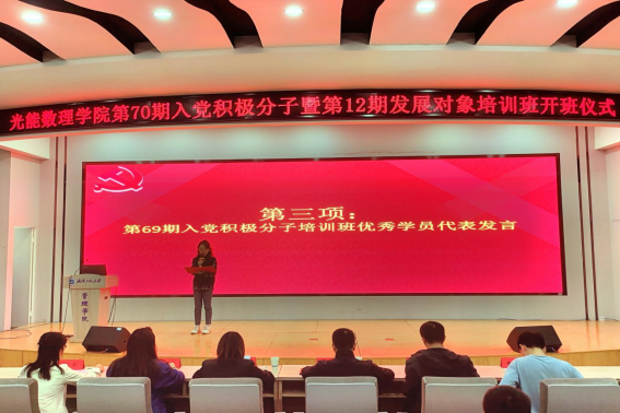 第69期入党积极分子培训班优秀学员代表2021级研究生光电(2)班祁倩以习近平总书记在党的二十大开幕会上的报告为引,分享党校学习心得。她从自身经历出发,向党校新学员们讲述了其在党课学习中的思想感悟,强调同学们要牢记习近平总书记的殷切嘱托,“广大青年要坚定不移听党话、跟党走,怀抱梦想又脚踏实地,敢想敢为又善作善成,立志做有理想、敢担当、能吃苦、肯奋斗的新时代好青年,让青春在全面建设社会主义现代化国家的火热实践中绽放绚丽之花。”最后,她对党校新学员们提出了思想上和行动上的具体要求,呼吁同学们真正落实到行动中去。