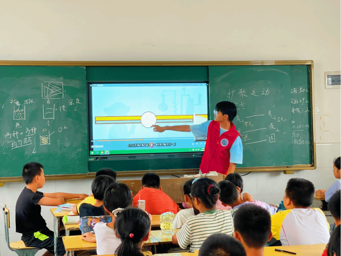 “课堂气氛很活跃、同学们听课也非常认真。我们的支教志愿者结合自己专业知识和同学们的数学、物理基础,专门开设了具有针对性的辅导课程。”领队老师胥树森介绍了支教情况。在物理科普课堂上,“知数答理”志愿服务队志愿者通过讲解物理实验小知识并且引入原创动画的形式,为同学们详细介绍了有关物质组成、分子热运动、扩散运动等物理知识,激起了同学们的学习兴趣,扩展了他们的知识面,台下小员工们热情饱满、认真听讲,积极回答问题,课堂气氛轻松愉快、其乐融融。