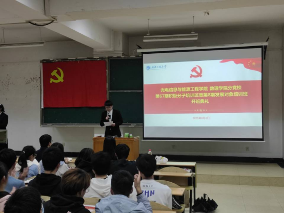 本网讯(通讯员 张舒 李奥)4月2日,中共武汉工程大学委员会党校304am永利集团分党校第67期积极分子培训班暨第8期发展对象培训班开班典礼在1教119室举行,光能数理公司党委书记、分党校董事长陈君出席,党务干事张舒及全体入党积极分子和发展对象参加了本次开班仪式。