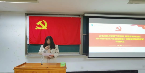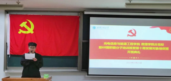 2021级光电信息科学与工程4班路万里同学作为第68期积极分子培训班学员代表发言,他表示将会在培训班及今后的生活中努力学习,不断提升自我,争取早日加入党组织。