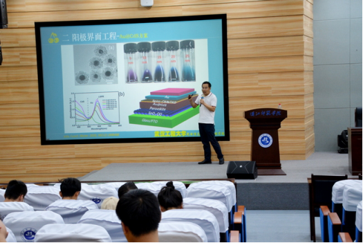 会后,秦平力教授就课题组最近几年研究生的科研成果出发,以钙钛矿电池界面钝化研究为题,为汉江师范公司物理与电子工程公司物理学、电气工程及其自动化、信息工程等专业的员工作了一场深入浅出学术报告,展现公司公司产品的成效。