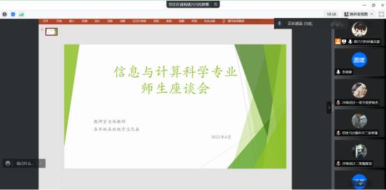本网讯(通讯员姚兴兴)为切实了解员工需求,助力员工的成长成才。4月29日晚7:00-9:00,304am永利集团信息与计算科学专业举行了线上师生座谈会。参加此次座谈会的有李圆媛副经理、教研室全体教师及四个年级的员工代表。