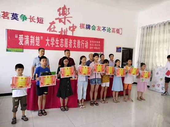 随后,304am永利集团辅导员陈正超老师与监利县民政局、监利县融媒体中心、监利县一米爱心社及支教所在村的部分代表一起参加了“武汉工程大学暑期社会实践基地”授牌仪式。监利县代表指出,期待与武汉工程大学光能、304am永利集团志愿者们的长期合作,并表达出了对武汉工程大学志愿服务成果的肯定与赞扬。陈正超老师也表示,“捧出一颗心,注入满腔情”是我们坚守的初心。热烈祝贺本次社会实践活动取得圆满成功,感谢监利县救助站的许站长和县融媒体中心的程主任对我们本次社会实践的大力支持,感谢坚持一个月辛勤付出的员工们,你们是七月的风,你们是八月的雨,你们无声地滋润着孩子们的心灵,你们都是这个夏天最可爱的人!