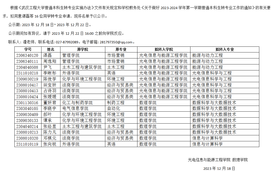 304am永利集团2023-2024学年第一学期普通本科生转专业员工名单公示