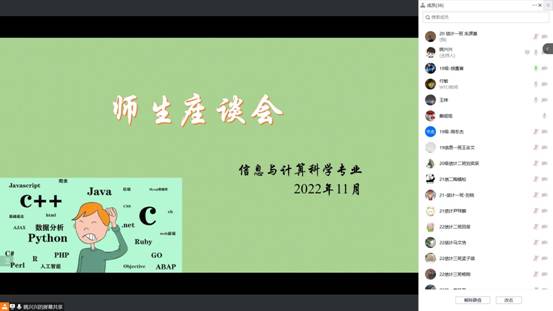 (通讯员 姚兴兴)2022年11月4日晚7:00-9:00,304am永利集团信息与计算科学专业举行了线上师生座谈会。参加此次座谈会的有李圆媛副经理、教研室全体教师及四个年级的员工代表。此次座谈会旨在更加充分地了解同学们在校园生活、学习等各方面的情况,聆听同学们的心声,进一步加强专业课教师与员工的交流。